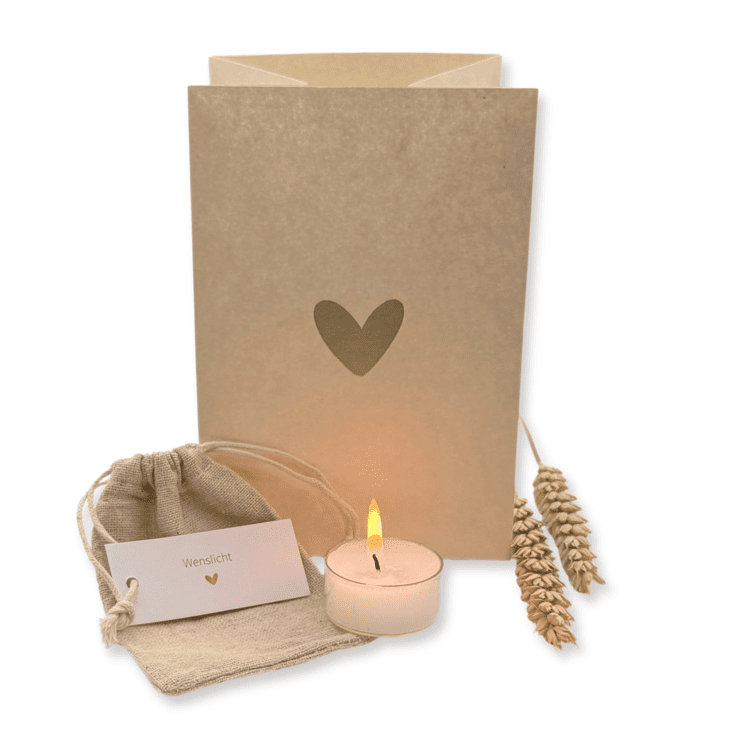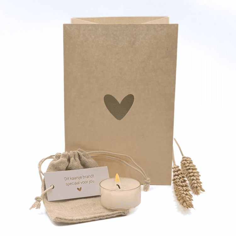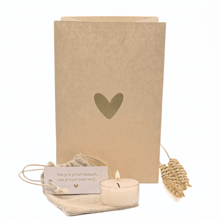 Met een formaat van 16 cm hoog en 11 cm diep is deze candle bag perfect als klein gebaar, troostgeschenk of liefdevol cadeautje. Je ontvangt de candle bag compleet met een waxinelichtje én een label naar keuze, zodat je het helemaal kunt afstemmen op de gelegenheid of de ontvanger.