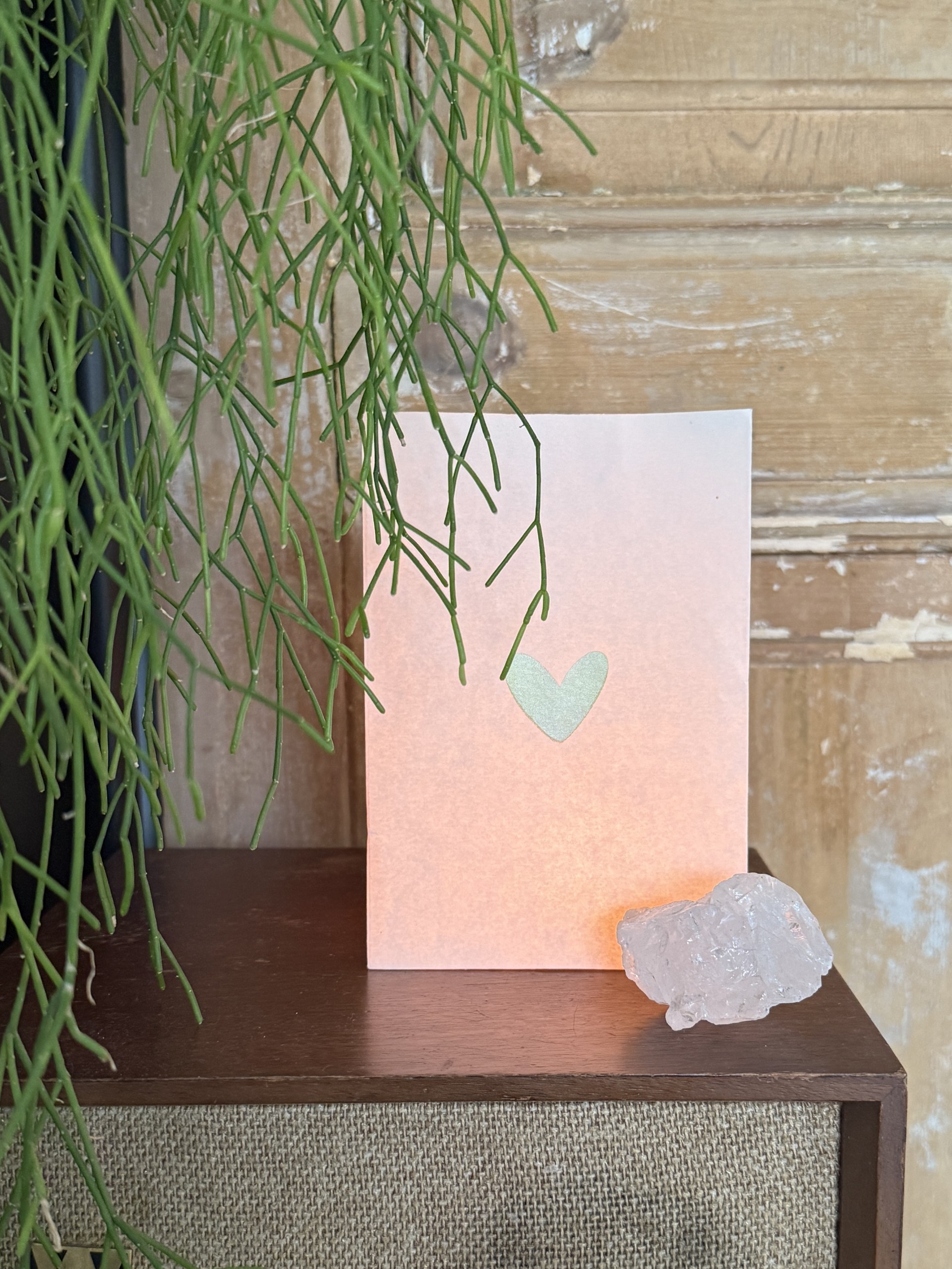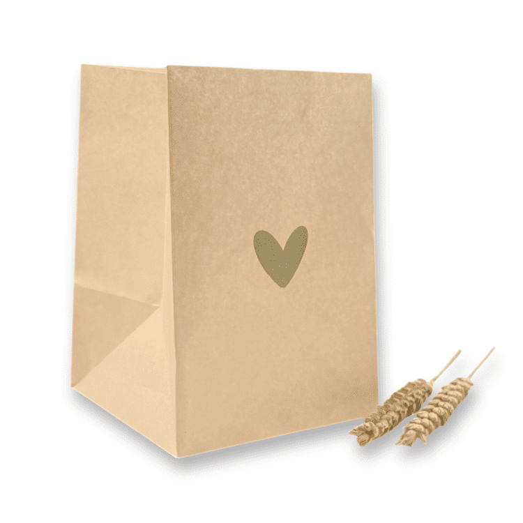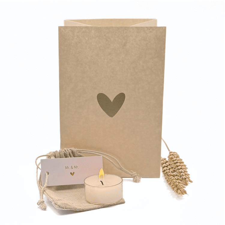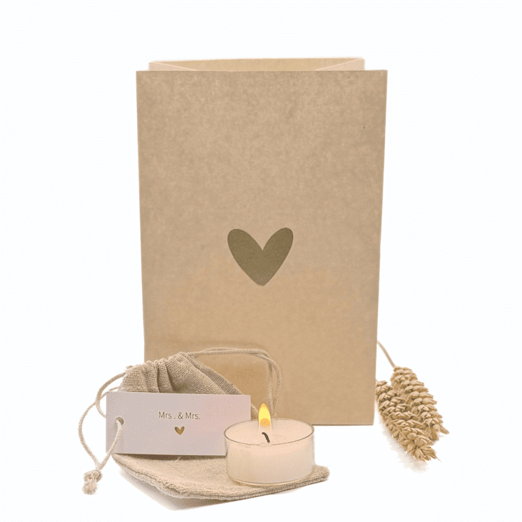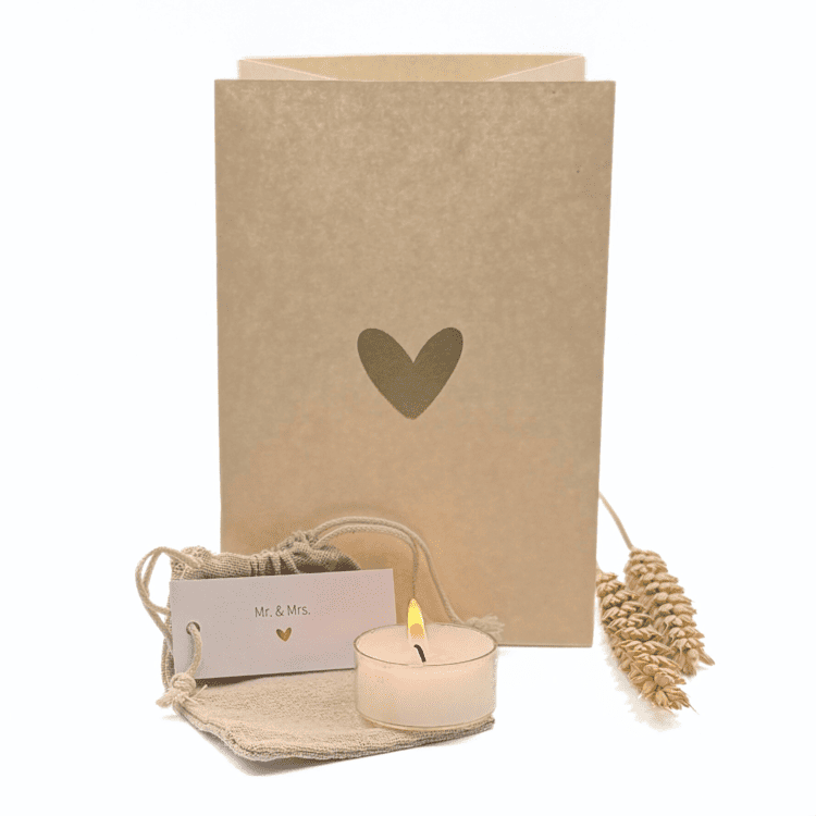 Deze stijlvolle candle bag brengt direct sfeer in elke ruimte. De crème-kleurige zak is voorzien van een subtiel, goudkleurig hartje op de voorkant, vakkundig gedrukt door onze zeefdrukker. Door het zachte licht dat door het materiaal heen schijnt, ontstaat een warm en rustgevend effect.