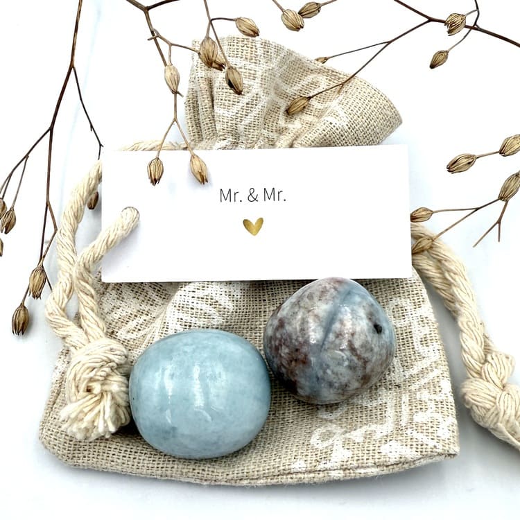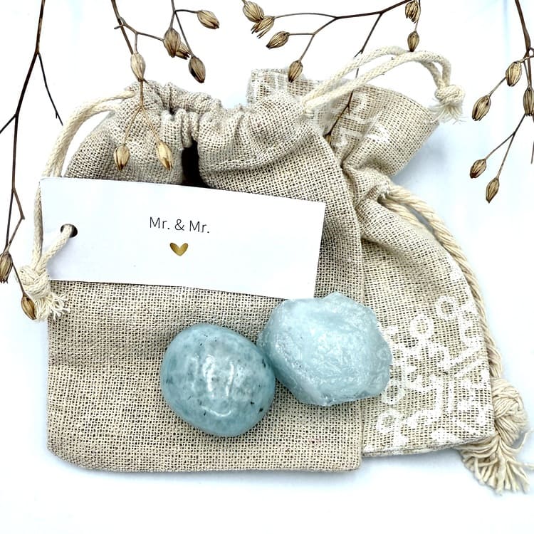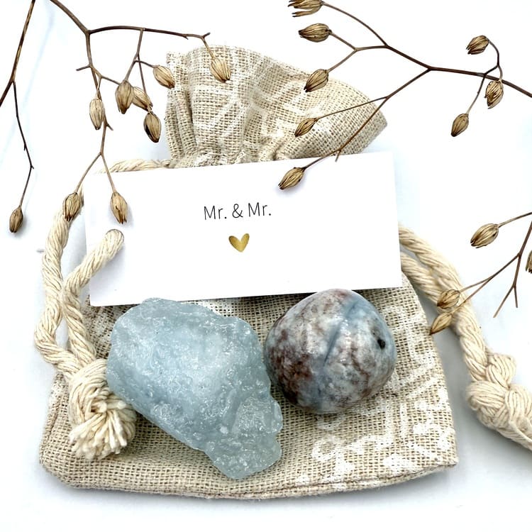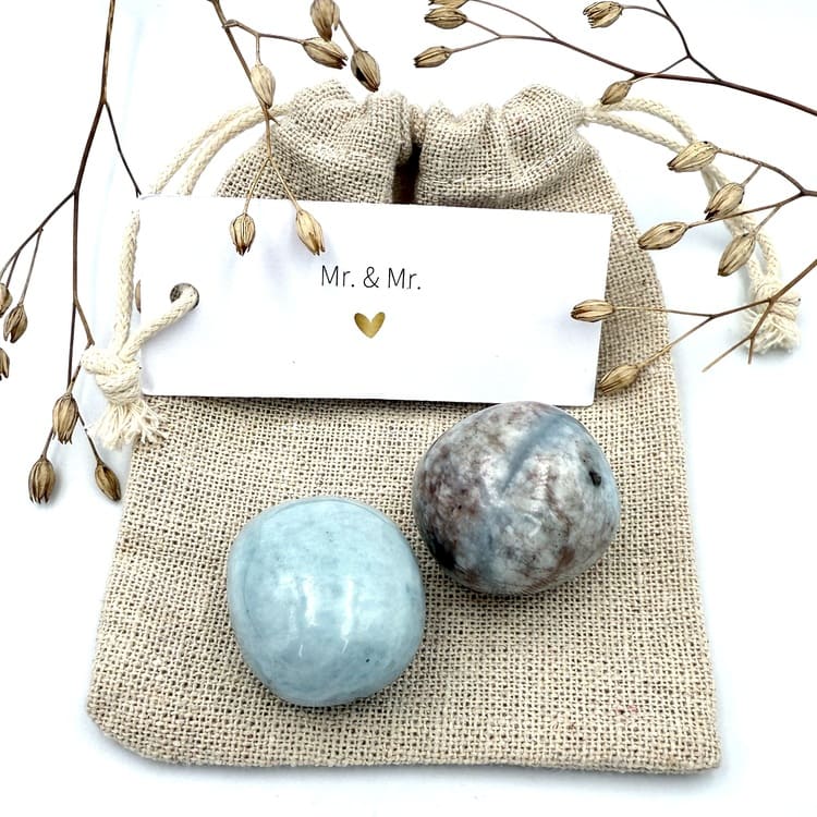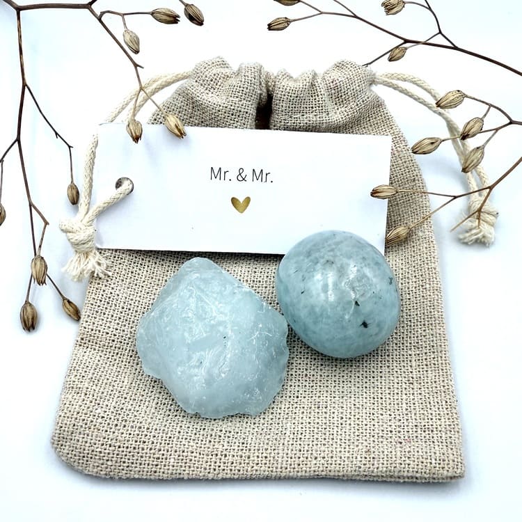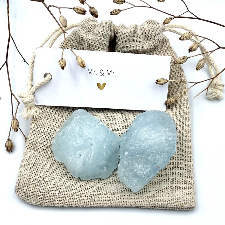 Vier de liefde met het Mr. & Mr. zakje, gevuld met de edelsteen Aquamarijn – de steen van harmonie, vertrouwen en kalmte. Perfect als symbolisch cadeau voor een huwelijk, jubileum of om samen de liefde te vieren.