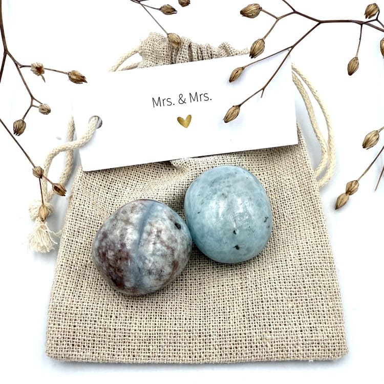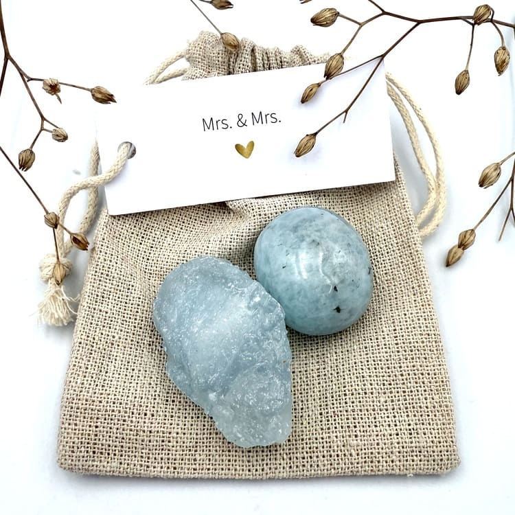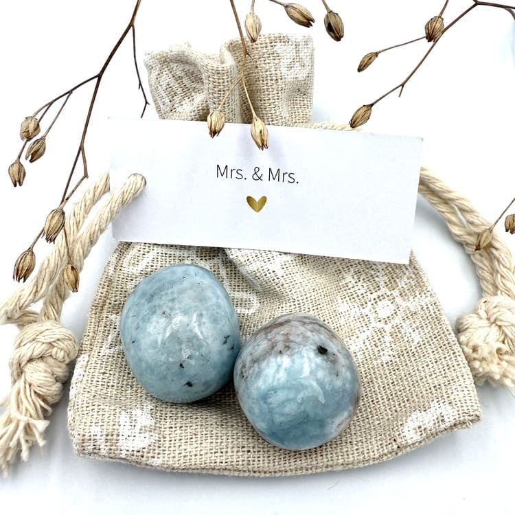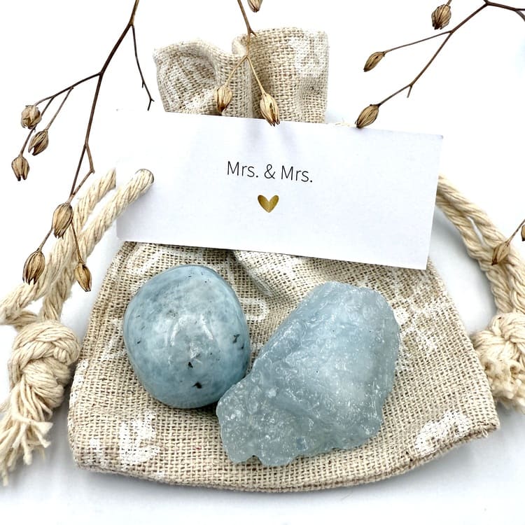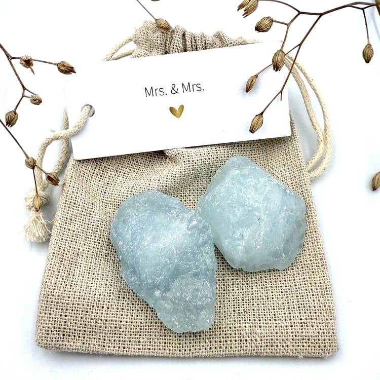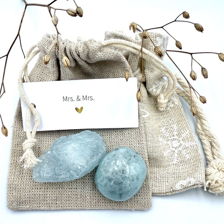 Vier de liefde met het Mrs. & Mrs. zakje, gevuld met de edelsteen Aquamarijn – de steen van harmonie, vertrouwen en kalmte. Perfect als symbolisch cadeau voor een huwelijk, jubileum of om samen de liefde te vieren.