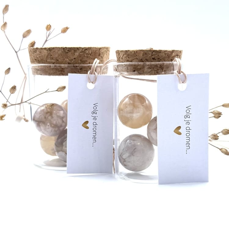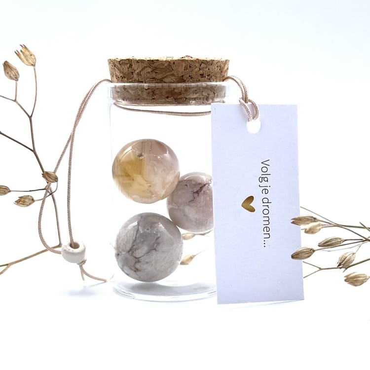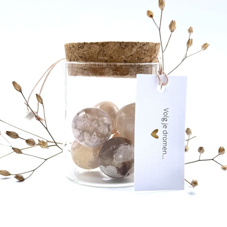 Het potje 'Volg je dromen…' bevat de Bloemagaat en een omschrijving van de werking van deze edelsteen. De Bloemagaat staat symbool voor de kracht om 'te groeien & te bloeien'.