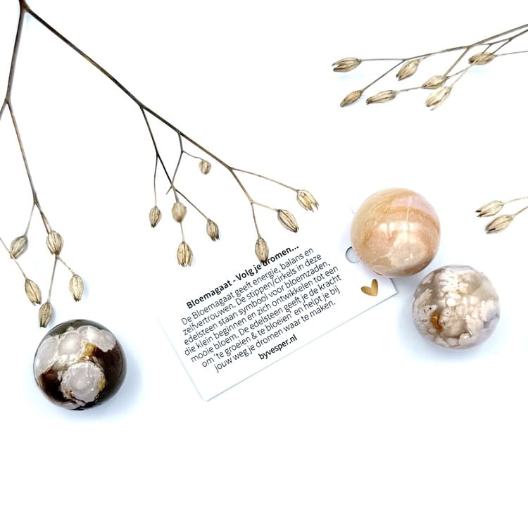 De Bloemagaat geeft energie, balans en zelfvertrouwen. De stippen/cirkels in deze edelsteen staan symbool voor bloemzaden, die klein beginnen en zich ontwikkelen tot een mooie bloem. De edelsteen geeft je de kracht om 'te groeien & te bloeien' en helpt je bij jouw weg je dromen waar te maken.